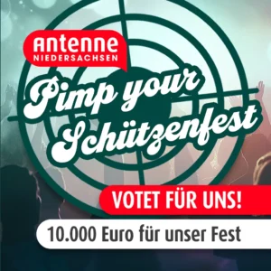 Wow – Antenne Niedersachsen „Pimp Your Schützenfest“! Wir sind dabei und können 10.000 Euro für unser Fest gewinnen. Unterstützt uns und votet für unseren Schützenverein. Bitte teilt dies mit allen, die ihr kennt – jede Stimme zählt!
